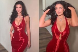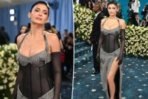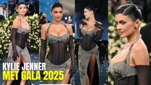 Kylie appeared in a Ferragamo halter-neck costume with wool herringbone cups and a long dress with a high cut in the waist at the 2025 Met Gala. The standout? A sheer bodice of corset which showed skin underneath. She took long transparent gloves and sharp heels to add additional drama.