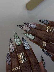 Butterfly nail art is a significant trend as a Spring Nail Inspo as it brings a fun and light-hearted style to your nails. These styles have usually soft pastel backgrounds with subtle butterfly drawings.