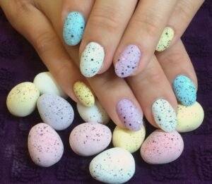 The speckled egg nail is a replica of the look of small bird eggs. In this design, a soft pastel background is normally employed with small black speckles all over the surface.