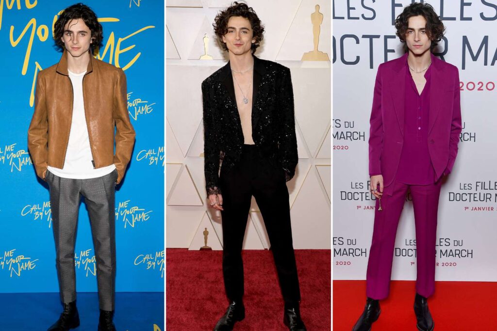 Timothee Chalamet has reinvented the formal fashion among men. He does not wear traditional black tuxedos, but the striking fabrics, unusual cuts, and trendy designs.