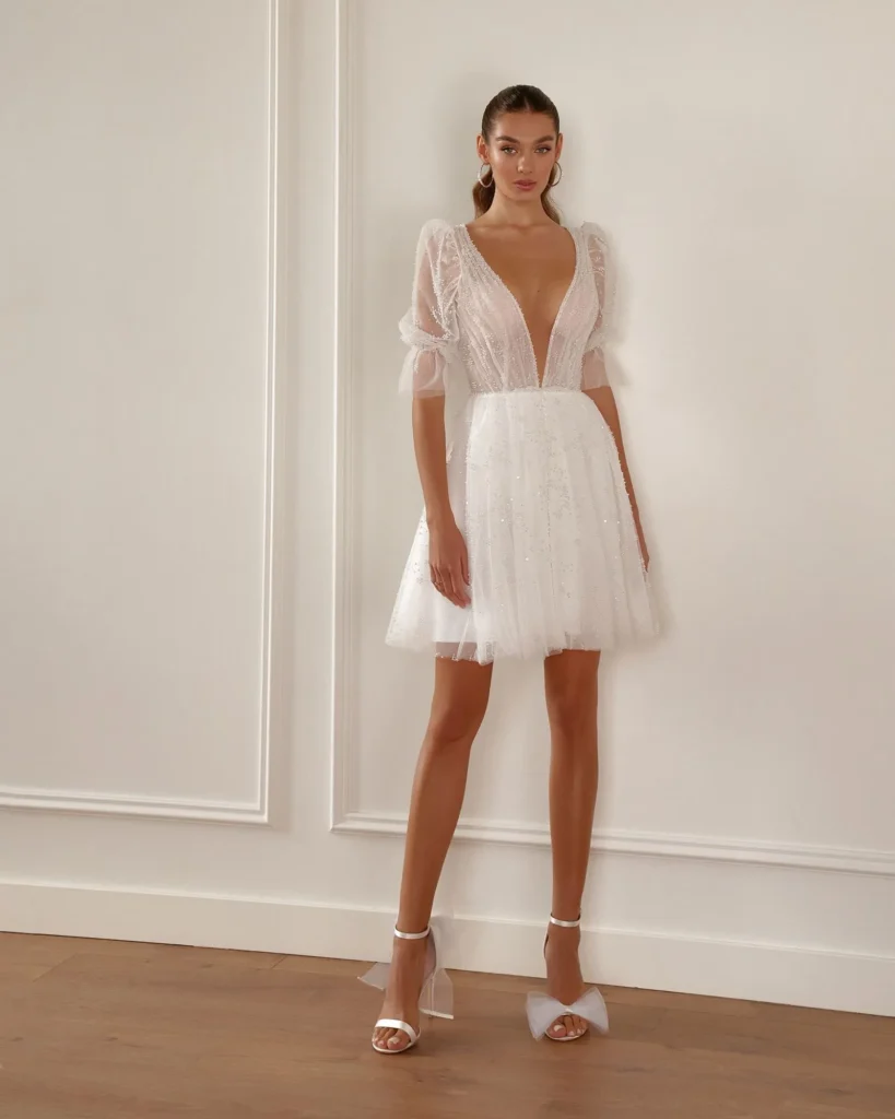 This style is characterized by clean lines, smooth cuts, and fabrics. A short wedding dress is a minimalist dress, and is based on structure, but not ornamentation, allowing the bride to radiate in her natural form.