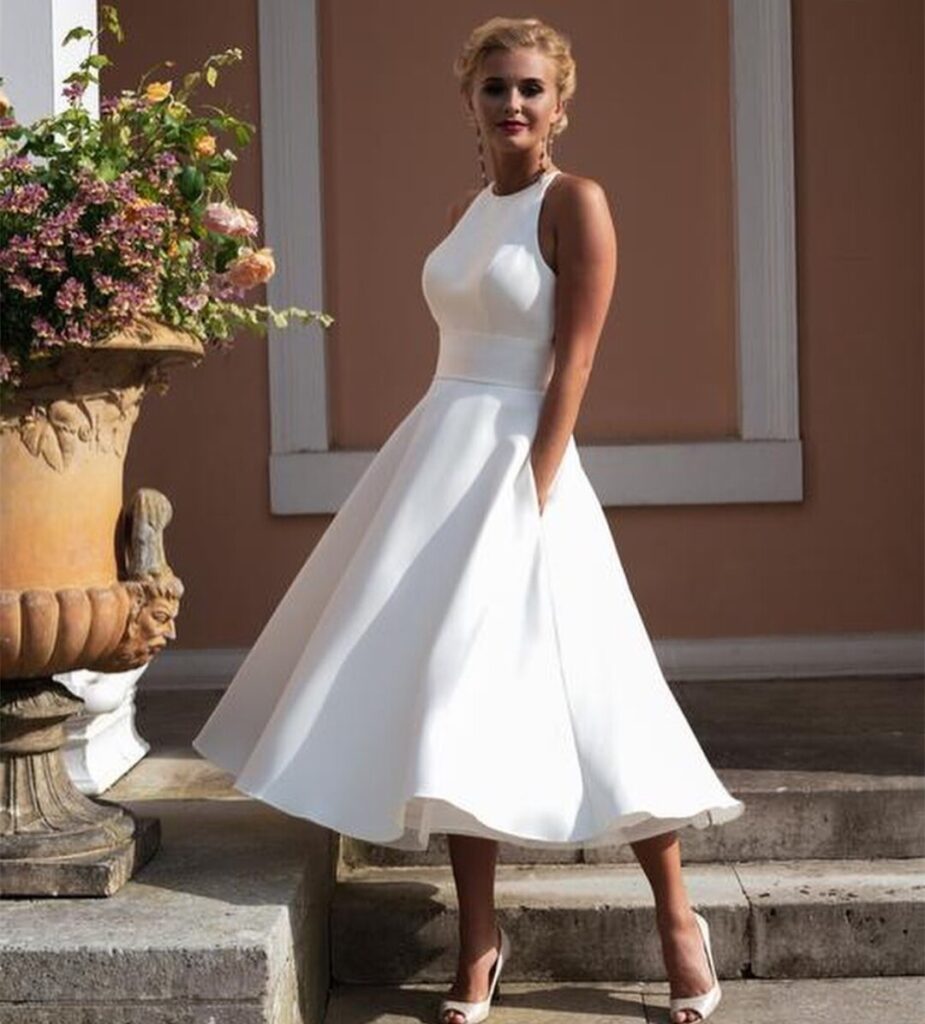 Tea-length dresses are in between knee and ankle, which have a retro graceful look. The style inspired by the 1950s is ideal to be used in classic heels or bridal flats.