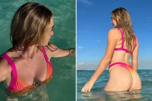 One of her top savings of 2025 was a sensuous pink micro bikini in a pool. The color is bright in contrast to her tanned body.
